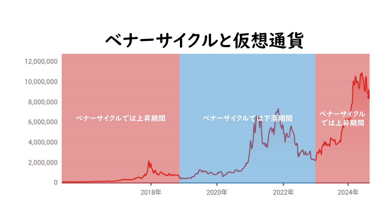 仮想通貨(ビットコイン)のチャートとベナーサイクルを照らし合わせて見ました。仮想通貨は最近でてきたものでもあるため、さすがに一致度は低くなっています。