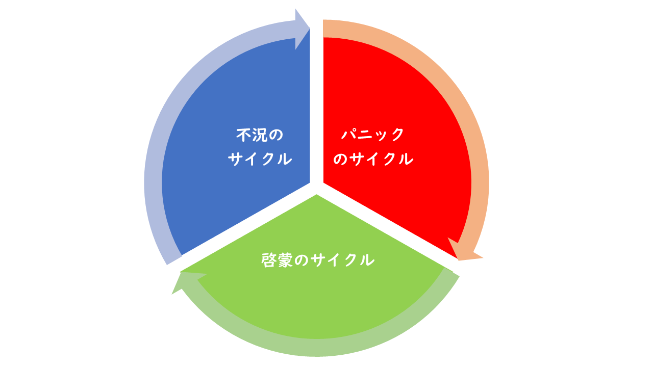 パニックのサイクル、啓蒙のサイクル、不況のサイクルはこちらの通り。常にこの3つのフェーズを行ったり来たりと繰り返し、株式市場は動いていきます。