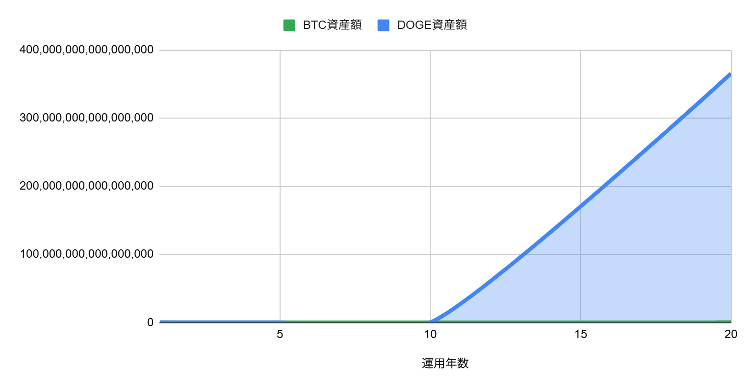 | 経過年数 | BTC資産額 | DOGE資産額 |