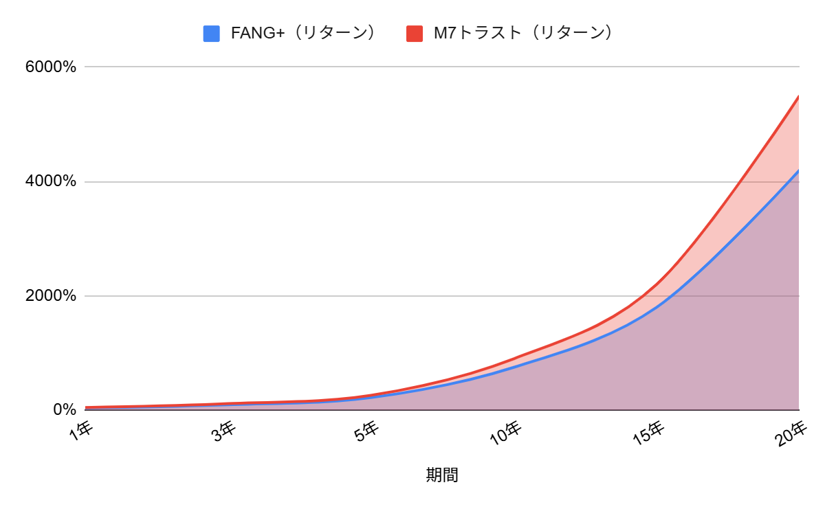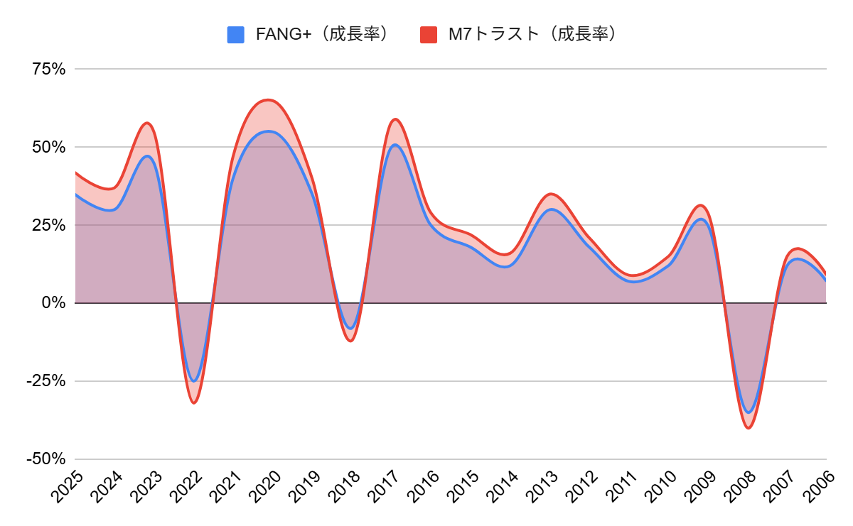FANG+は均等加重で最新の銘柄も含まれますが、M7トラストは現時点で最も時価総額が大きく、市場を牽引している7銘柄に究極的に集中しているからです。成長率の爆発力は、より集中している方が高いと想定されます。