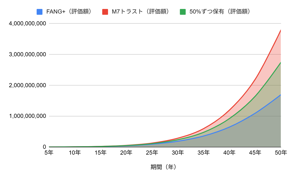 ここでは初期投資100万円を想定し、50年間運用したときの評価額を比較してみましょう。7銘柄に絞ったM7トラスト単独がリターンではリードしますが、ボラティリティの低減のため両方持つ戦略も有効です。