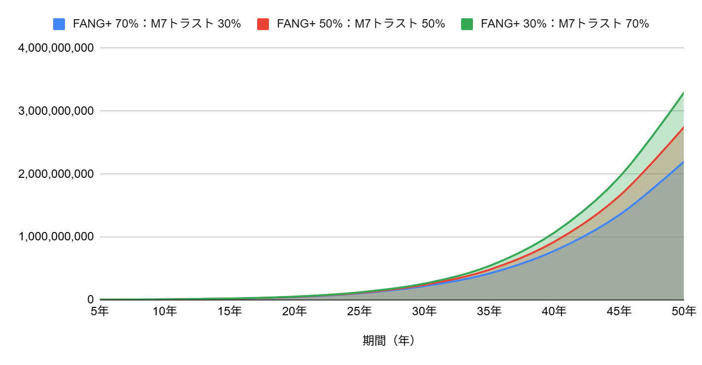 | 年数 | FANG+ 70%:M7トラスト 30% | FANG+ 50%:M7トラスト 50% | FANG+ 30%:M7トラスト 70% |