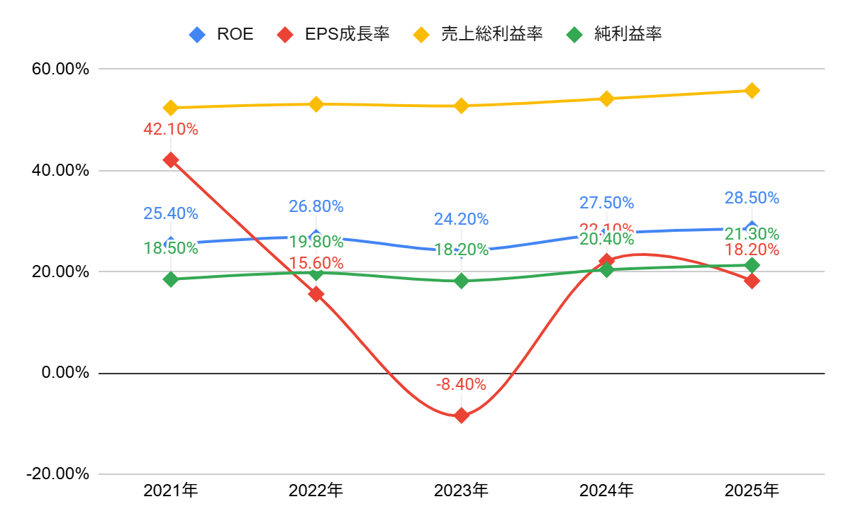 | EPS成長率 | 42.10% | 15.60% | -8.40% | 22.10% | 18.20% |