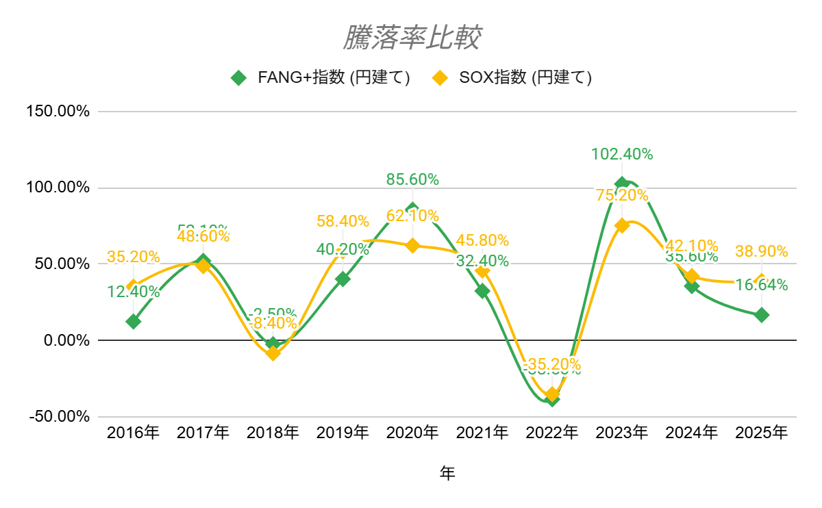 | 年 | FANG+指数 (円建て) | SOX指数 (円建て) |