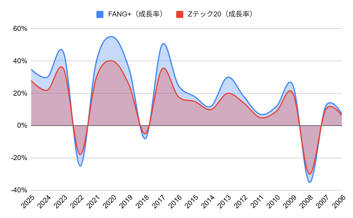 | 年 | FANG+(成長率) | Zテック20(成長率) | FANG+(騰落率) | Zテック20(騰落率) |