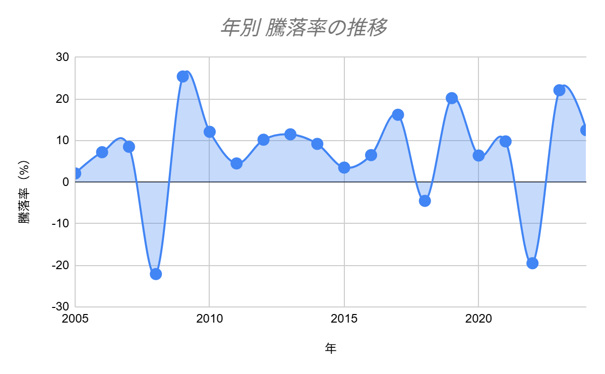 過去20年間の年間騰落率をまとめました。2013年以前はバックテストによる想定数値です。NASDAQ100指数の上昇を権利放棄する戦略のため、市場が爆発的に上昇する年でもQYLDの上昇幅は限定的になりますが、分配金を含めるとプラスを維持する年が多いです。